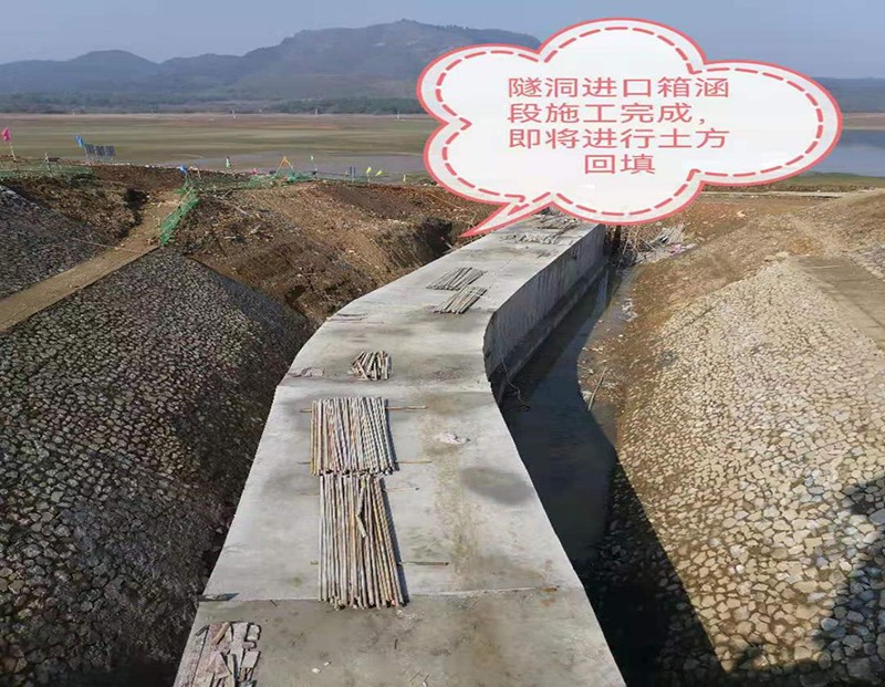 工程于2021年10月26日正式开工,目前已完成主要形象进度有:大坝坝坡修整、大坝左岸粘土铺盖和粘土斜墙、坝下涵管内衬钢管、隧洞进口箱涵段和泄洪渠1+200~1+975 m,其它项目均按照计划工期有序推进,圆满完成2021年度施工任务,为完成2022年安全度汛打下坚实的基础。