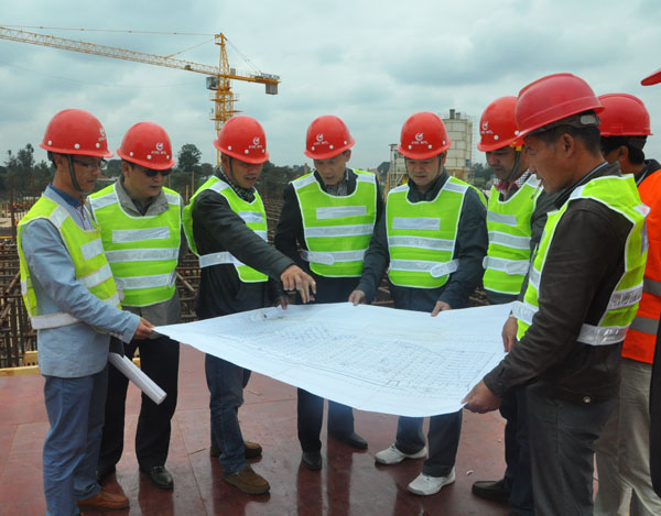 2014年8月8号,公司董事长王元旦、总会计师王义生,副总经理张周平、黄郑民一行抵达肯尼亚,开始了为期一周的巡视指导工作。刚下飞机,董事长王元旦一行便马不停蹄地赶往位于肯尼亚首都内罗毕的双河房地产项目一期、二期工地进行视察。